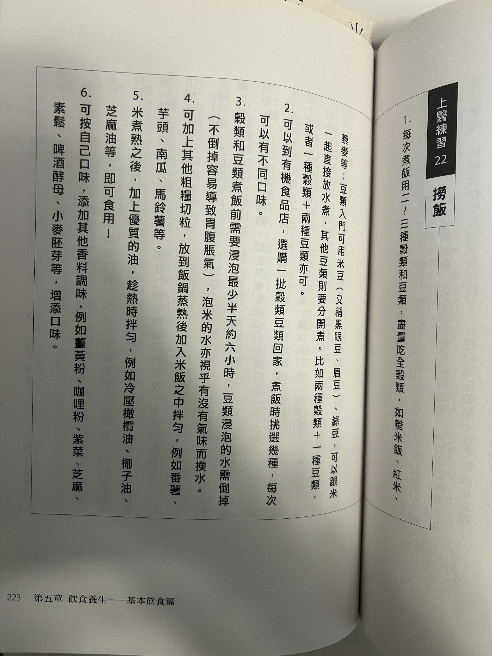 Skillful Doctor's Exercises 上醫練習 p. 222-226), which involves soaking whole grains (such as brown rice, quinoa, etc.) and legumes, cooking them, and then "