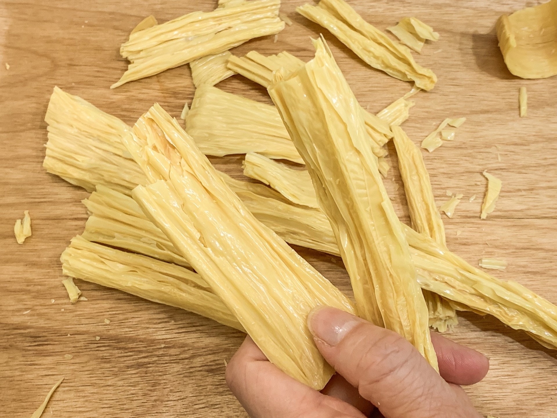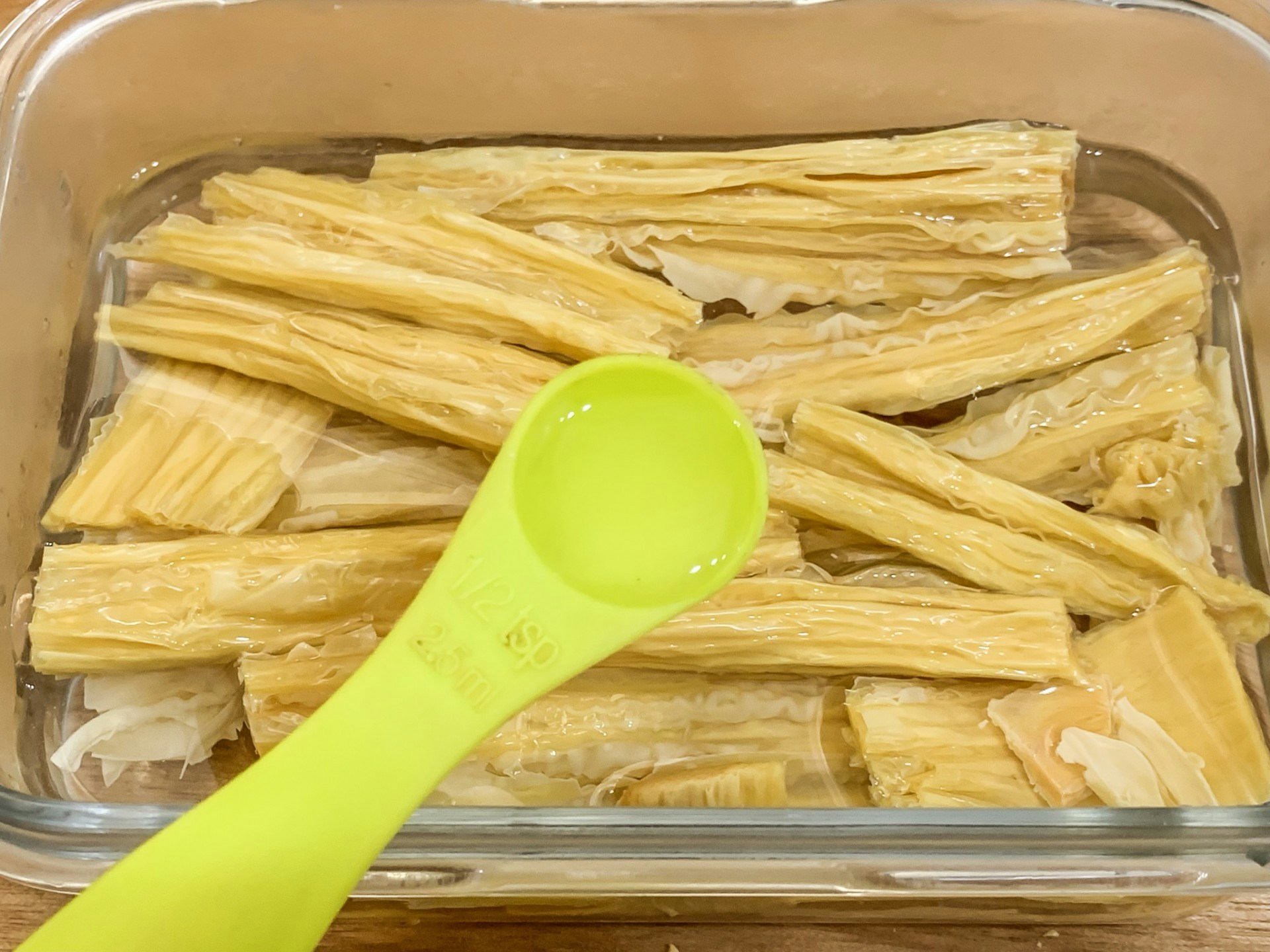 3️⃣ Air-dry the bean curd skin into strips and store it in the refrigerator❄️The fresh bamboo branches will be preserved;