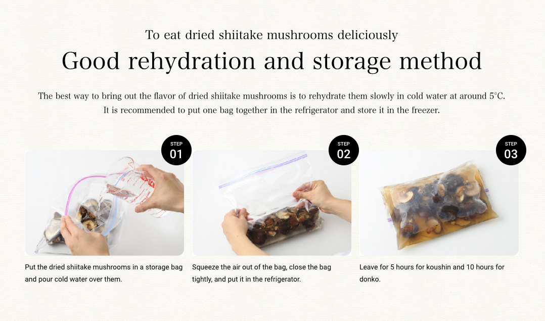 Whether the mushroom is fragrant or not depends on the kind of wood it grows on. "Japanese Oita Prefecture Shiitake Mushroom" is naturally cultivated with high-quality wood, and placed in Moriyama in Oita Prefecture to grow naturally for 18 months. During this period, there is absolutely no additive