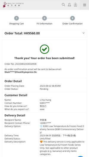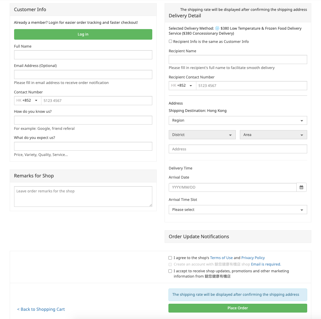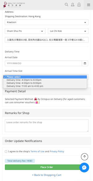 Customer name: Fill in the name [for example, John Barney] Phone number: fill in the mobile phone number Fill in other information: Answer how you know us and what you want us to do for you [for example: Friend referral / Convenience and price] Check: ✅ The recipient's information is the same as the customer's information Fill in the shipping address Select Hong Kong/Kowloon/New Territories, District [e.g. Central and Western District], District [e.g. Sai Ying Pun] Fill in the detailed address Select a Arrival Date Choose Arrival Time Slot (Reference Time purpose, not fixing a designated Time) Click out ✅ I agree to the website terms and privacy policy ✅ I accept to receive our latest news from Healthy Express and latest promotional information | ![]() |