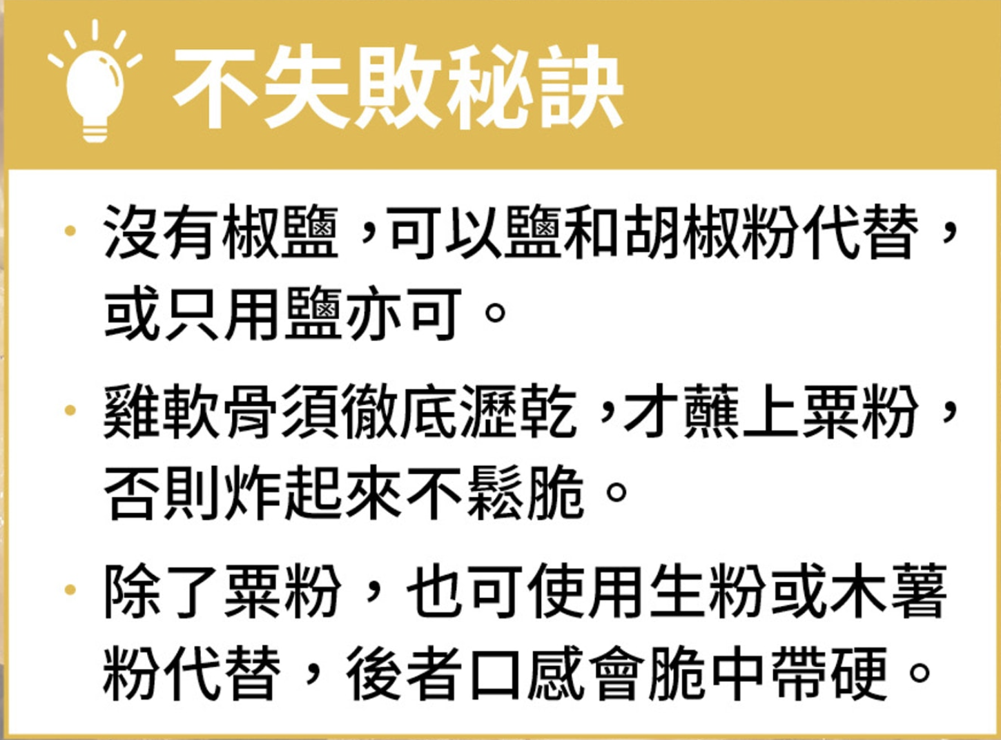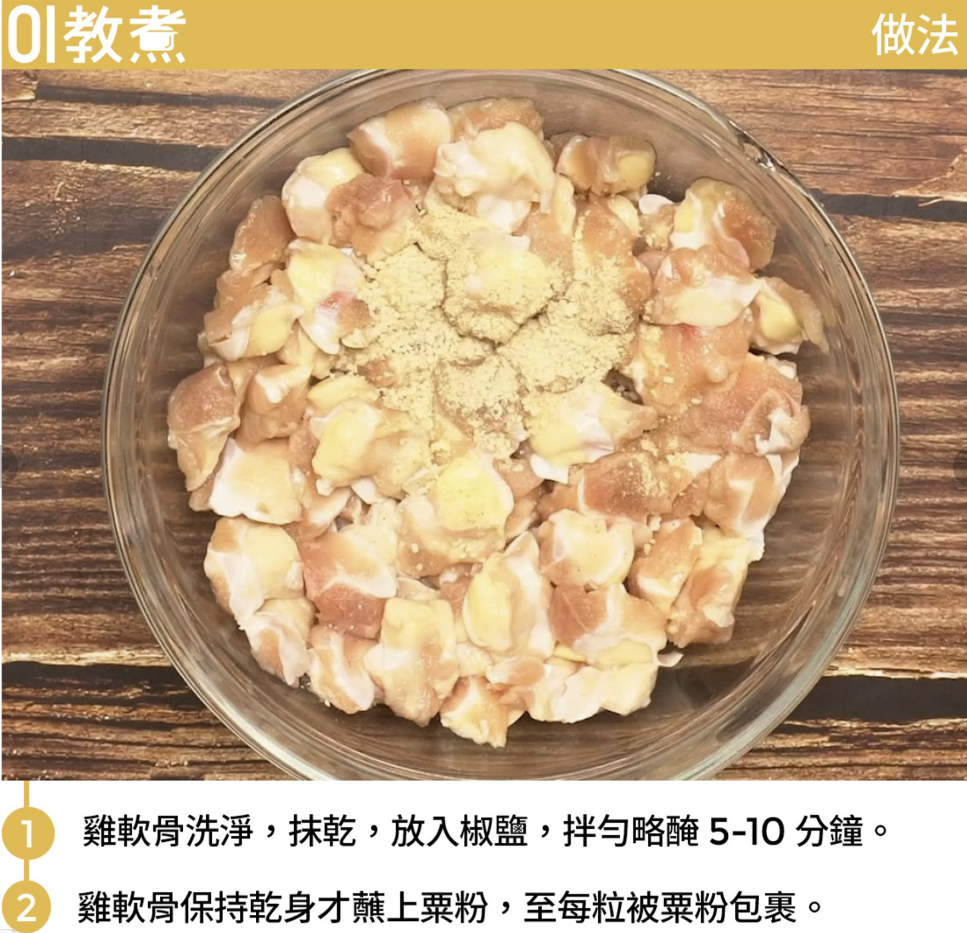 1. 雞軟骨洗淨,抹乾,放入椒鹽,拌勻略醃5-10分鐘。