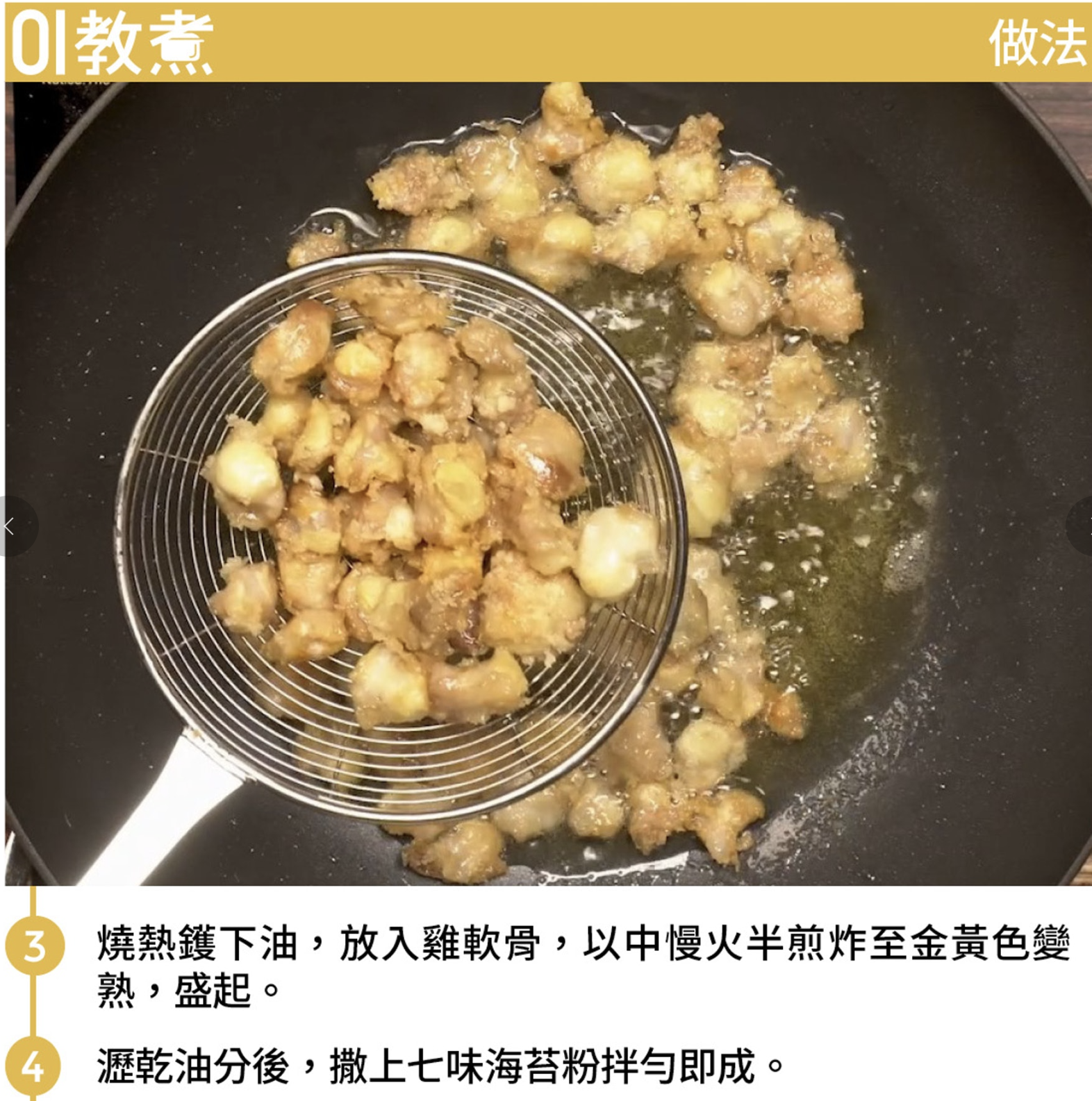 3. 燒熱鑊下油,放入雞軟骨,以中慢火半煎炸至金黃色變熟,盛起。