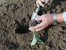 在苗床、苗盆及花盆上,按一定的株行距粘下種子,或將種子撒播其上,再蓋上較幼細的泥土或介質。一般沒有大量產苗的需要,故可用人手逐格下種,每格可下種子兩三粒,視種子的發芽率而定,再蓋上幼細的介質。待幼苗長出,再拔去弱株,為每穴留幼苗一株。苗杯下種的方法與人手下種的穴盤相同。切勿下種太多或太密,否則幼苗會因競爭生存空間而不斷拉長。