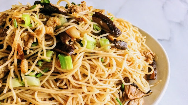 Put oil or lard in a hot pan over medium-low heat. Stir-fry the shredded shallots. Add the shredded shiitake mushrooms and stir-fry them after the shredded shallots turn golden brown. Add the shredded pork and stir-fry them after the shredded mushrooms smell good. Add the shrimps and stir-fry them after everything else in the pan is well cooked.