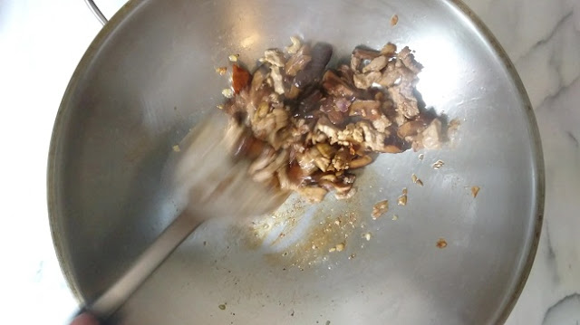 (4) 下大約一半的醬油(約 15 ml)拌炒配料入味後,盛起備用。