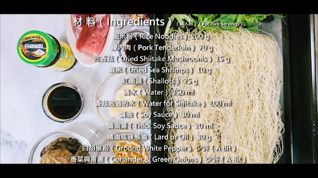 (1) 取出一片米粉(約 200 公克)用清水漂洗或沖洗後備用。洗米粉的時間以不超過十秒為原則,以免米粉吸取過多水分。