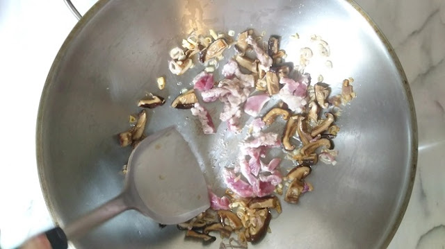 (3) 熱鍋入油開中小火,先煸炒紅蔥頭至產生香氣與金黃色澤,再加入香菇續煸炒至有香氣後,下肉絲炒熟,再下蝦米炒至有香氣。