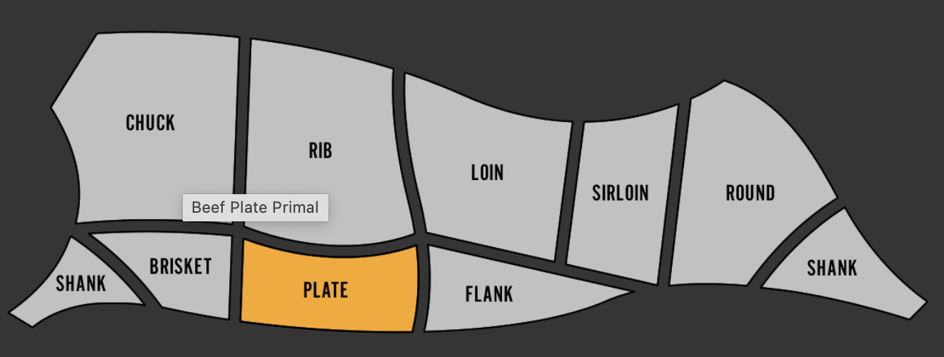 肋骨正下方的部分,脂肪含量較高。 Short Plate 是牛小排和碎牛肉的來源。這裡也是牛腩排的故鄉——牛腩排薄而美味,最好經過醃製並用大火煎烤。