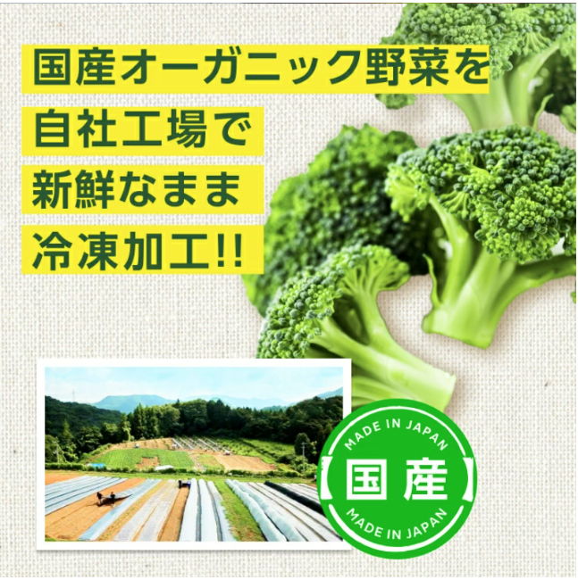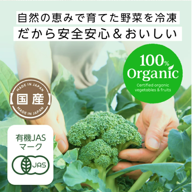 100% 有機冷凍西蘭花飯已通過有機 JAS 認證。自然生長的蔬菜經過冷凍處理,安全放心。口感好飽滿。