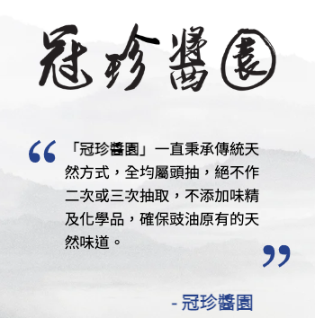 「冠珍醬園」屹立九十年, 一直堅持以「香港製造, 天然生晒, 頭遍抽取」的精神, 為顧客製作最優質和最天然原味的廣東傳統醬油和醬料。