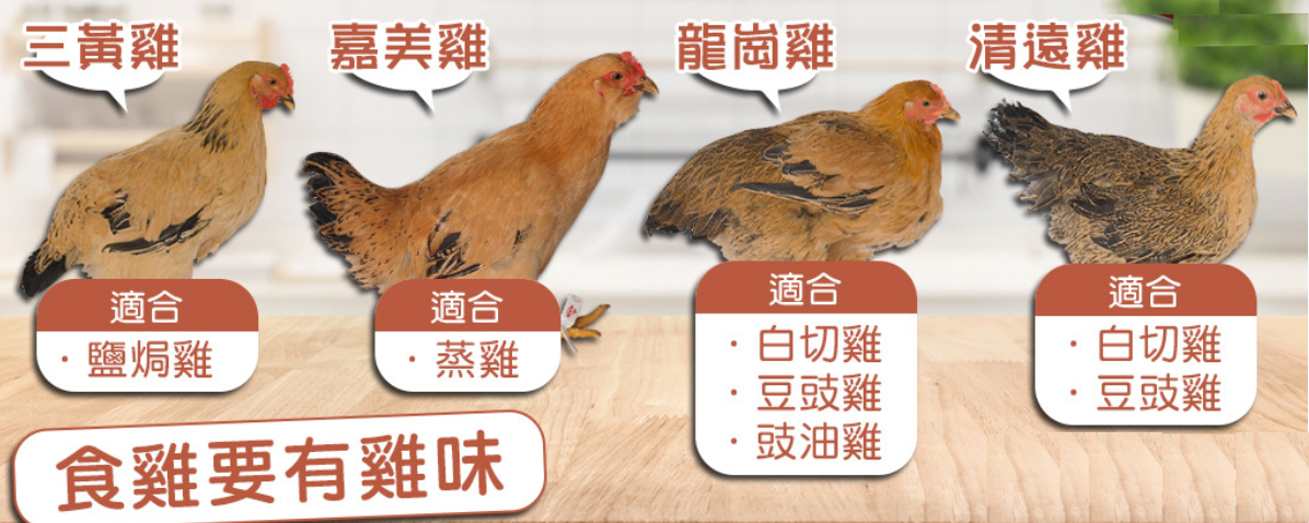 煮食方法:靚雞可以嘗試不需要紅蔥頭、薑,只需用粗鹽塗滿全身,更有雞味,亦可以考慮不用點薑蔥。最簡單可用電飯煲蒸法:煮飯電飯煲蒸熟後,等10分鐘。三黃雞身形肥胖,頸較短,羽毛黃棕色,肉質肥美軟滑,黃油較多,雞皮厚脂肪多,蒸雞以及炸雞的不二之選。