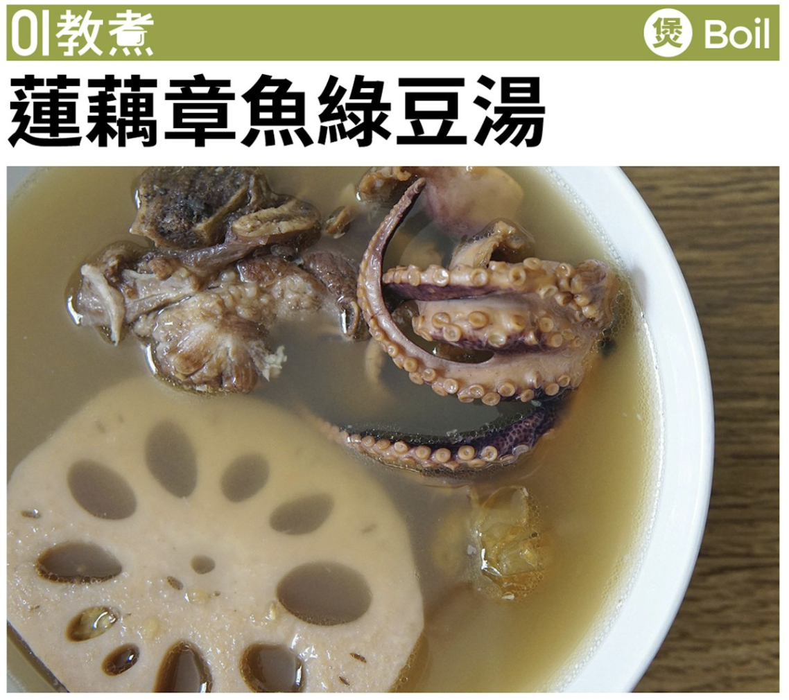 註冊中醫師邱穎琳指岀蓮藕章魚綠豆湯有補益氣血、滋陰潤膚的功效,對身體相當有益,以下是完整食譜!