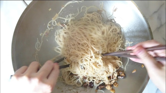 Lid off. Add the pre-stir-fried ingredients, mix them with the rice noodles and stir-fry them together. Add a bit of ground white pepper, the shredded coriander and green onions, and mix them with the rice noodles just before turning the heat off. Serve at once.