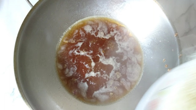 (5) 炒鍋內放入清水(約 350 ml)、泡香菇水、醬油膏、剩下的醬油煮滾後,放入先前洗好的米粉,以中小火燜煮約五分鐘。燜煮過程中宜短暫掀蓋兩三次以筷子拌炒。