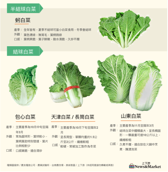 一般小白菜則可再細分成土白菜、奶油白菜、黑葉白菜等,謝明憲說明,不同類別的不結球白菜有著葉梗、葉片形狀及顏色的差異,例如:土白菜的葉色為黃綠、奶油白菜及黑葉白菜的葉柄都是白色、葉片顏色為墨綠,黑葉白菜的葉面皺;而體積較大的結球白菜則依照外型分為偏向橢圓的山東白菜及天津白菜、偏圓形的包心白菜。