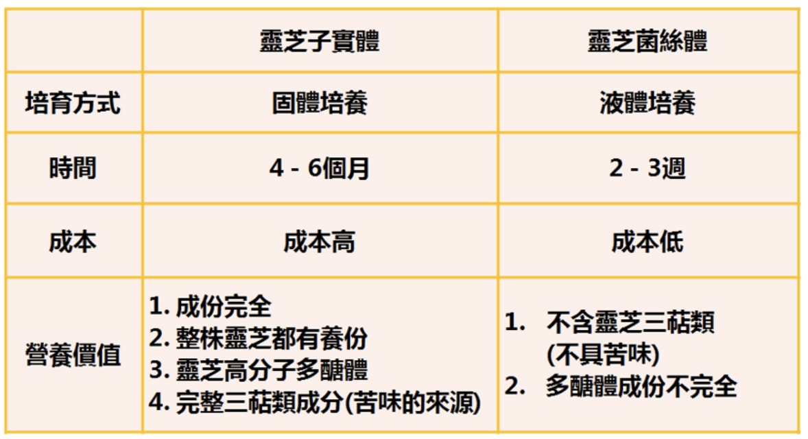 一株完整的靈芝,含有多醣體、三萜類、以及16種氨基酸、靈芝酸、微量元素等保健成分,分布在整株靈芝當中;而正是這些多元而獨特的成分,才使得靈芝如此珍貴。醫師何懷德表示,常聽到靈芝的「子實體」和「菌絲體」,其差別就在於是否具備完整的營養價值。所謂的「子實體」就是指整株完整的靈芝,成份完全,採用固體培養,一般而言,須要花費將近半年的時間才能培養出一株靈芝子實體。